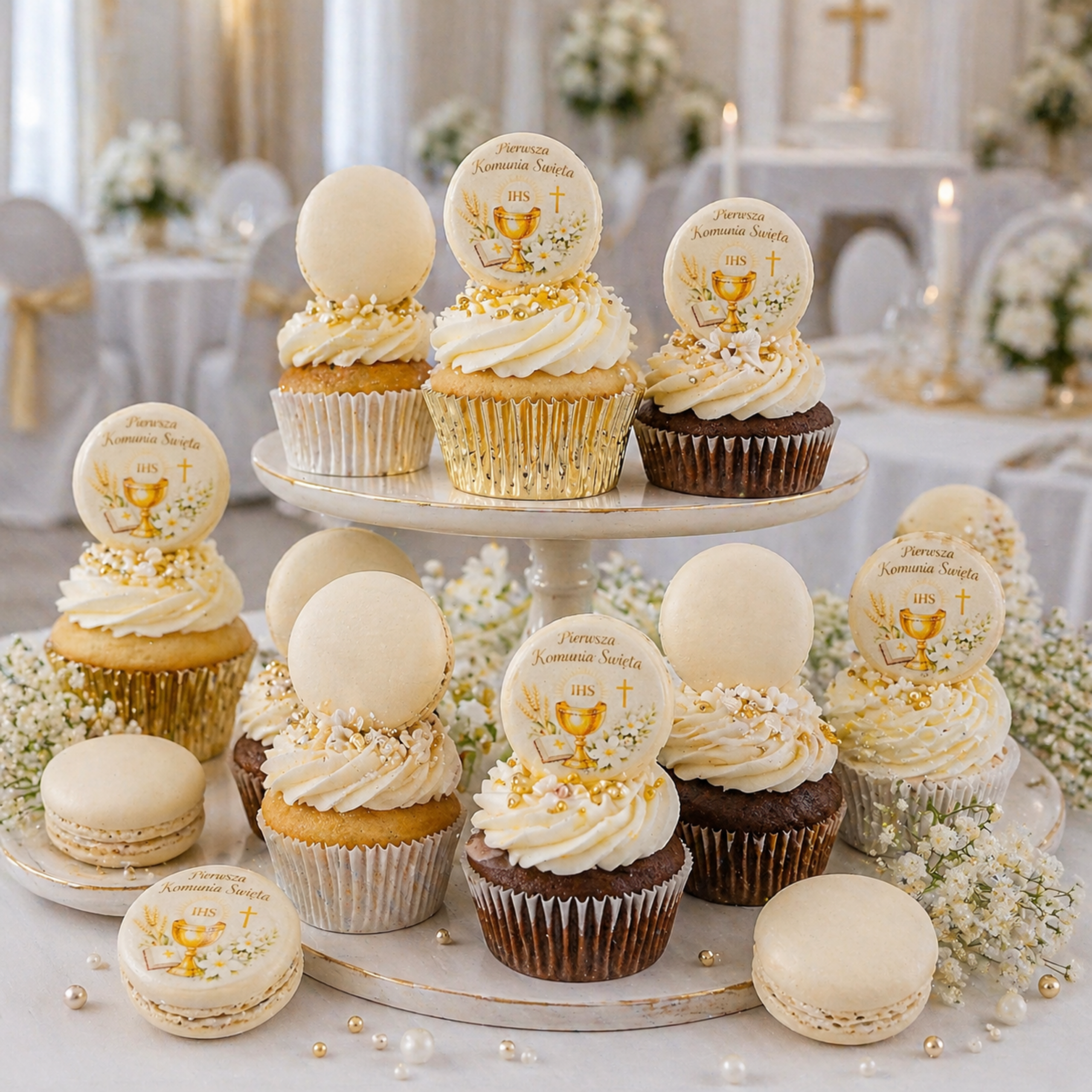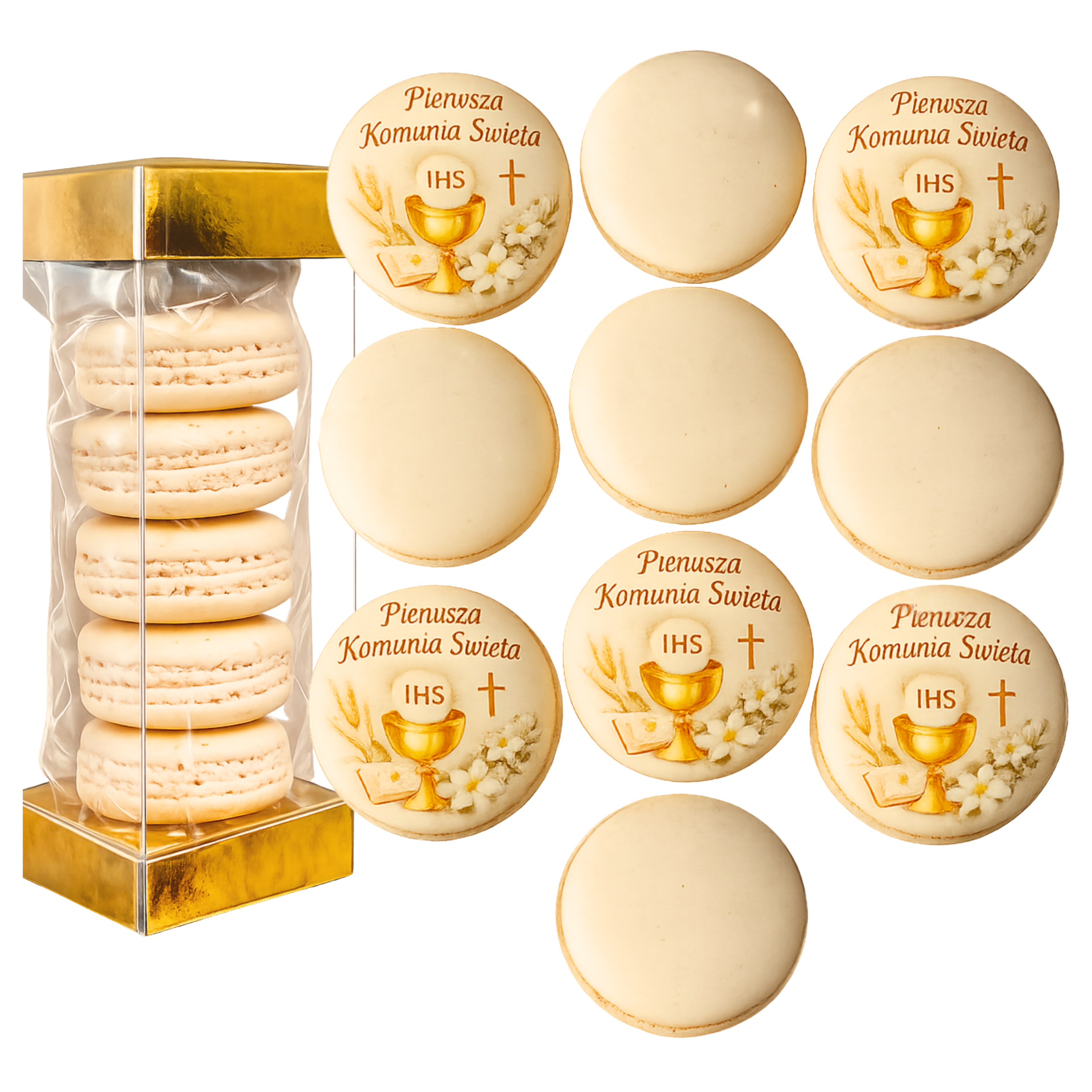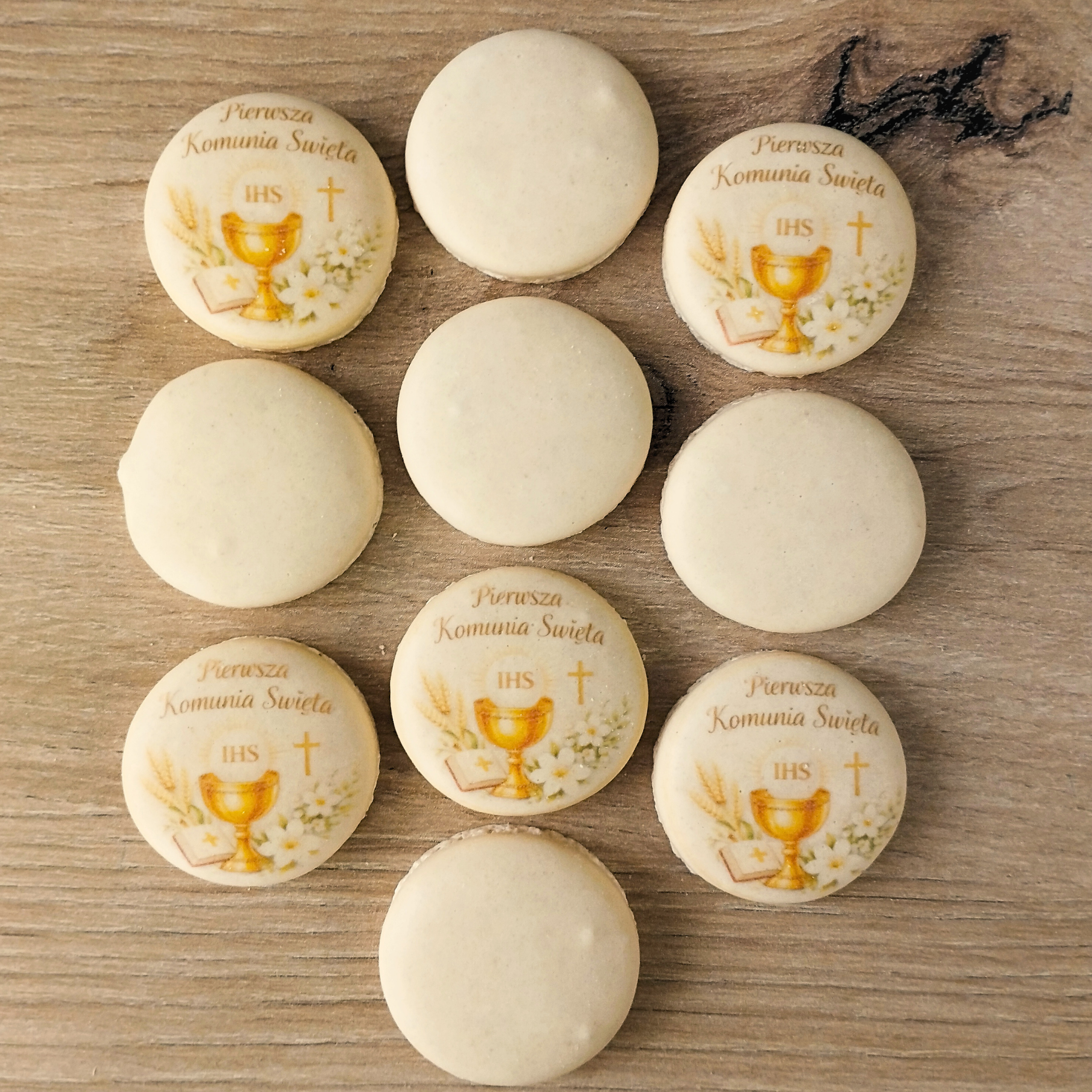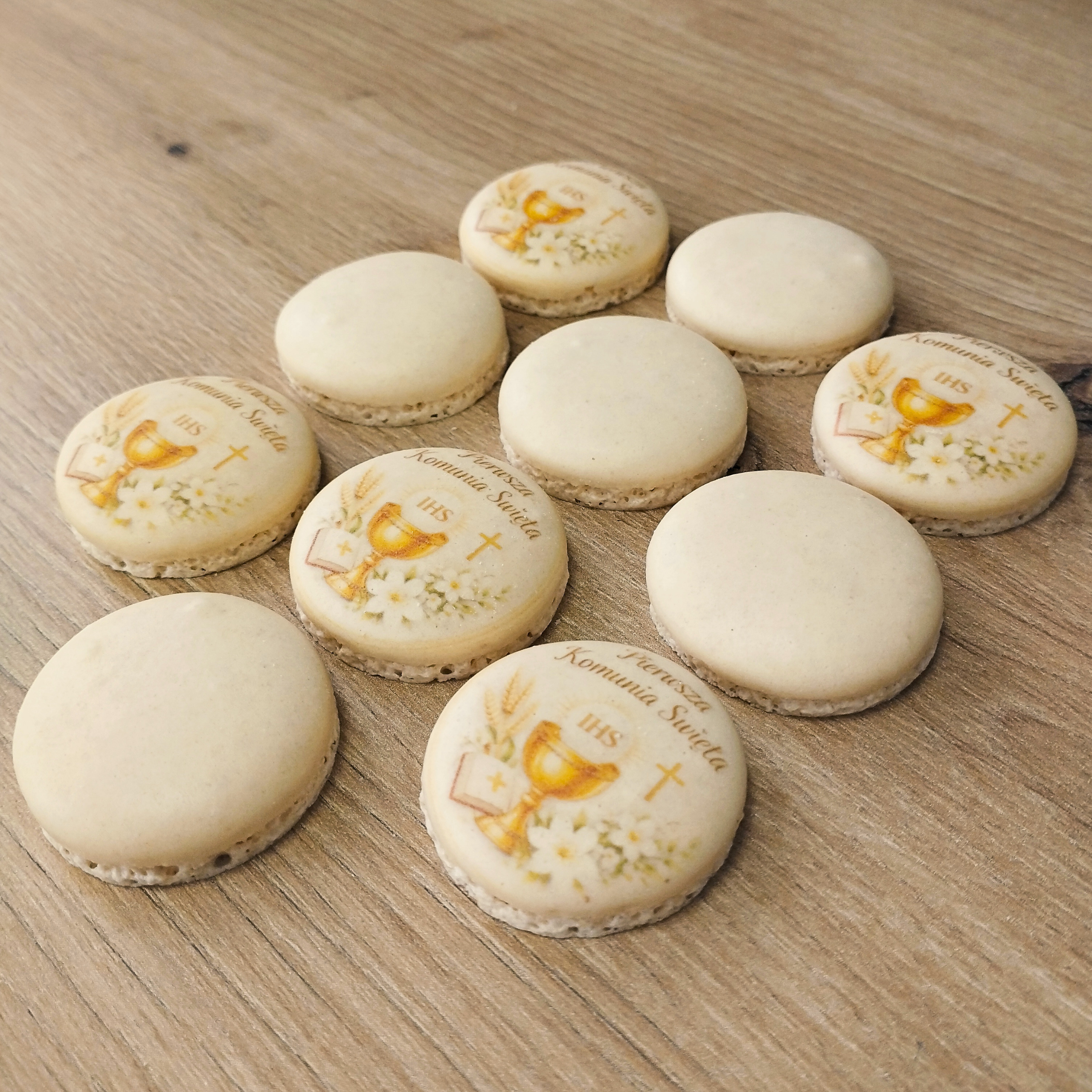 Makaroniki z nadrukiem: Składniki: Beza francuska, (BIAŁKO JAJA, cukry) MAKA MIGDAŁOWA, cukier niewyczuwalny, barwnik: E102, E110, E122, E124
